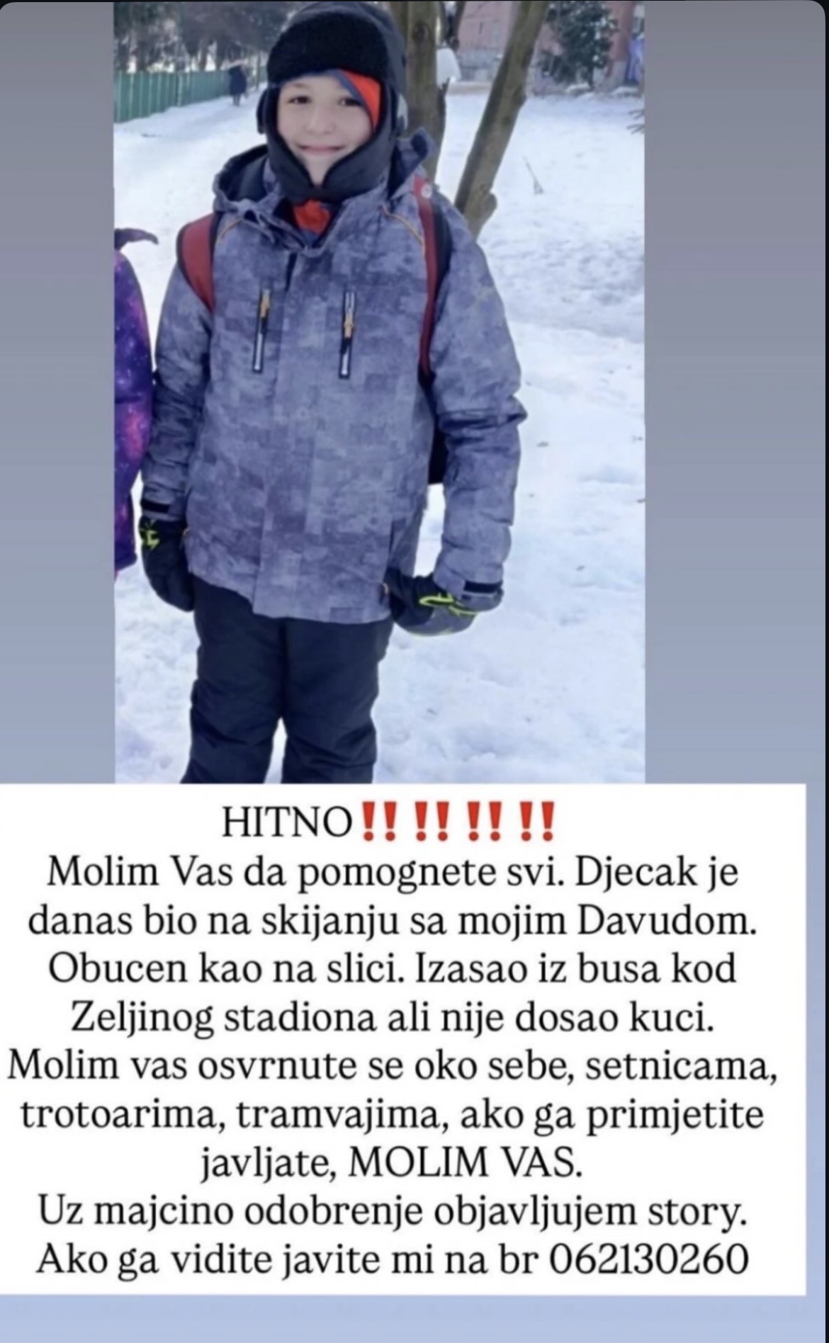 Dječak, prema saznanjima, bio je na izletu sa svojim prijateljem Davudom. Nažalost, nakon što su se vratili kući, on se nije pojavio. Iz autobusa je izašao u blizini stadiona Grbavica, ali od tada mu se gubi svaki trag. Njegova porodica opisuje dječaka kao veselog i vedrog, obučena u zimsku odjeću koja uključuje sivu jaknu s kapuljačom, tamne pantalone, rukavice i kapu. Ova informacija o njegovom izgledu je ključna, jer može pomoći svima koji su se zatekli u blizini da ga brže prepoznaju. U razgovoru sa njegovom majkom, ona opisuje kako je dječak uvijek bio znatiželjan i pun života, a svaki dan provodio je u igri s prijateljima, istražujući prirodu i svijet oko sebe.