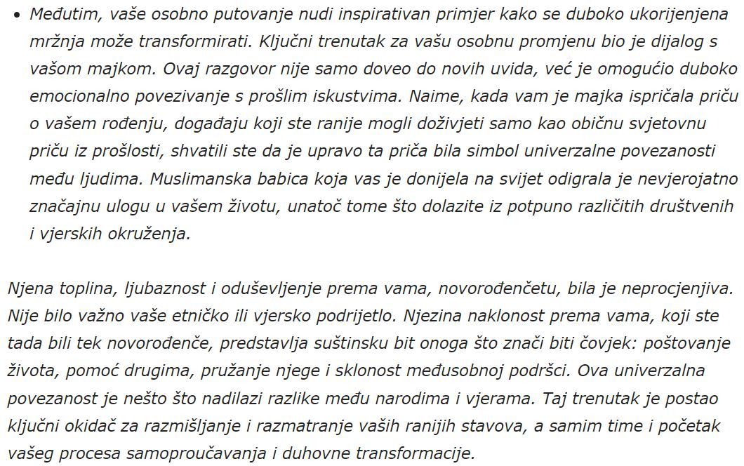Naše iskustvo i hrabrost da se suočimo s prošlošću predstavljaju važan primjer za sve nas. Promjene se ne događaju preko noći, ali svaki korak prema razumijevanju i prihvatanju otvara vrata za bolju budućnost. Naša ljudska iskustva su univerzalna, a iako se suočavamo s različitim izazovima, možemo zajedno raditi na izgradnji svijeta u kojem su poštovanje i uzajamno prihvatanje temeljne vrijednosti.